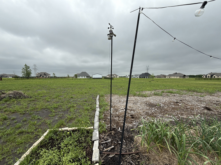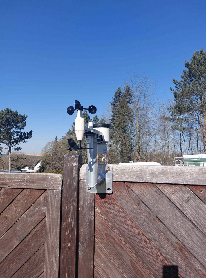 - The photo that would depict the southern horizon is missing. If it were available, it would likely show that the roof reaches a level higher than the station, blocking at least the airflow (if not also sunlight when the sun is low, for example). If the station were placed at the roof’s peak on a mast of at least 1.25 m, the roof would not have a significant impact on wind and temperature measurements.