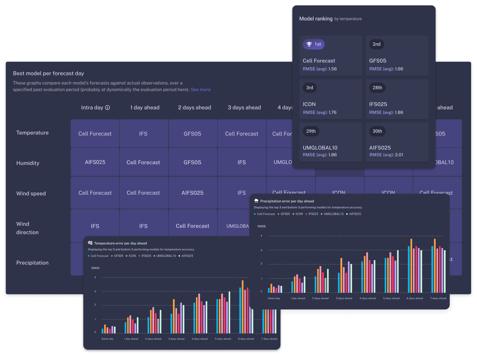 Continuously monitor and compare the performance of 40+ leading global weather models to identify the most accurate forecasts for your specific location. This empowers you to make smarter, weather-driven decisions and optimize operations with confidence.